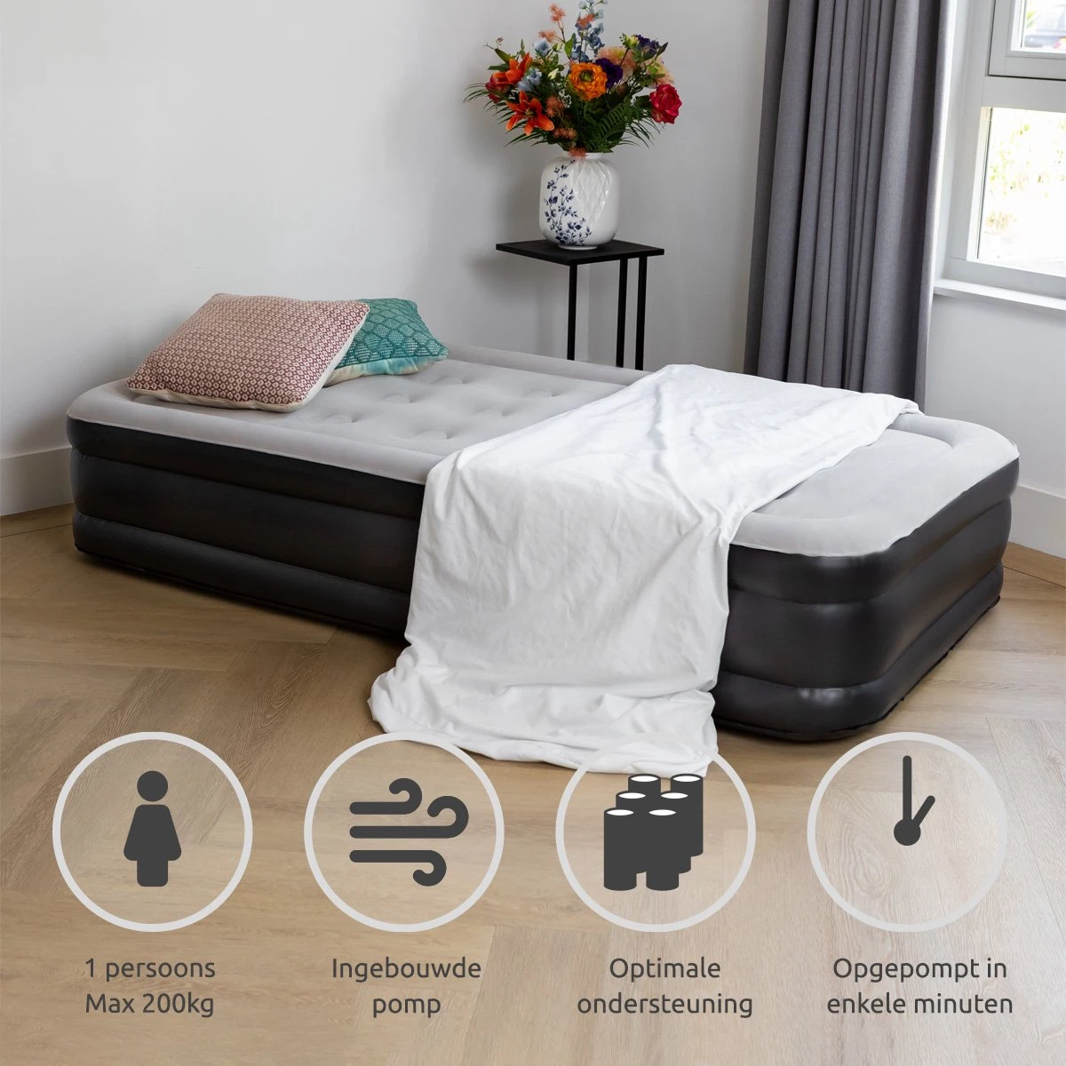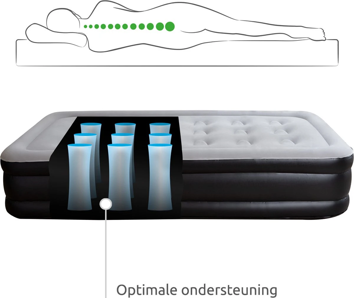 Het luchtbed heeft een zachte bovenkant van grijs velours en een verhoging van 36 cm, zodat u er ‘s nachts niet af kunt rollen en het aanvoelt als een echt bed. Dankzij de naadloze lastechniek en kwalitatieve dikke materiaal is het bed volledig luchtdicht, lekbestendig, waterafstotend en bestand tegen beschadigingen. Bovendien zorgt de antislip onderkant voor extra stevigheid.