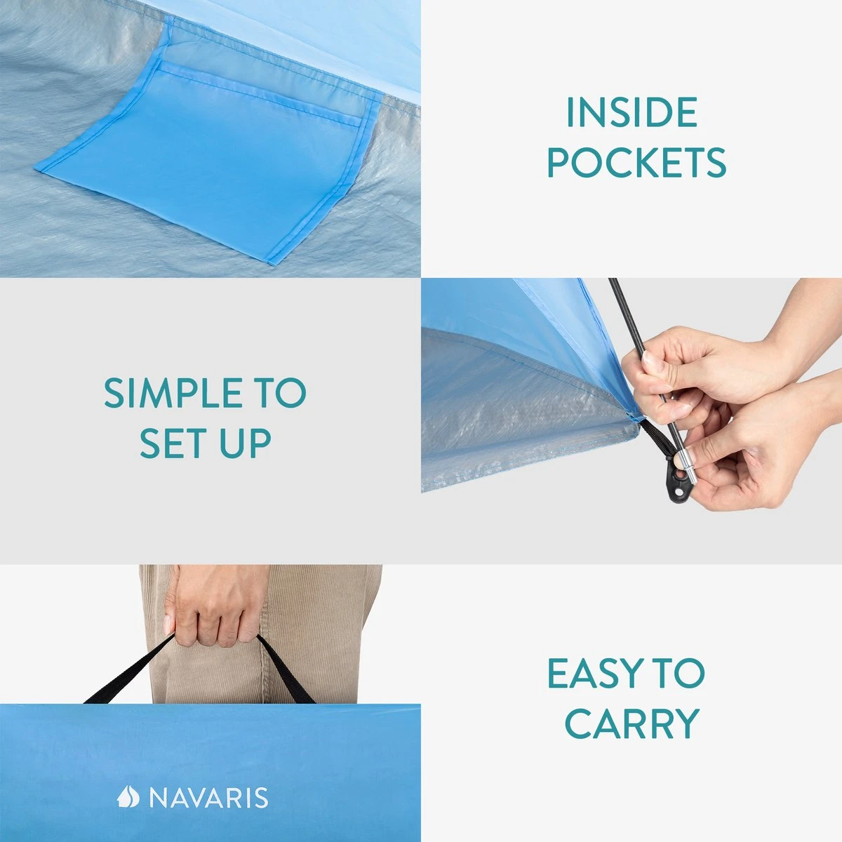 Deze pop-up tent van Navaris is een echte must-have voor de zomer: hij biedt een droge ondergrond en bescherming tegen zon en wind op het strand, op de camping of in het park. PER DRIE