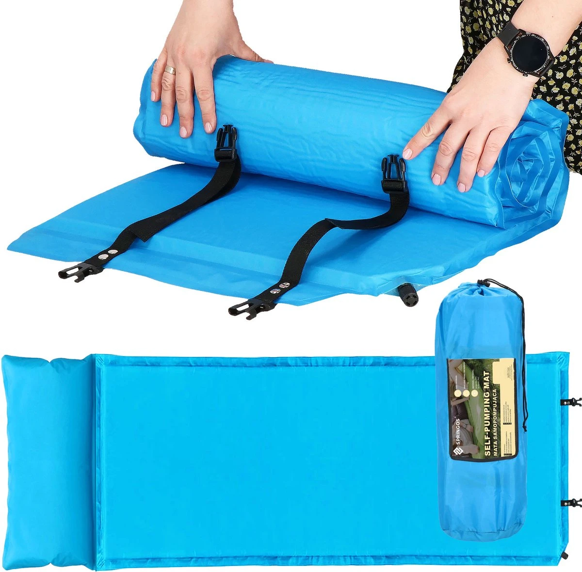 Springos Slaapmat | Zelfopblazend | 186 Cm | Inclusief Hoes & Hoofdkussen | Lichtblauw