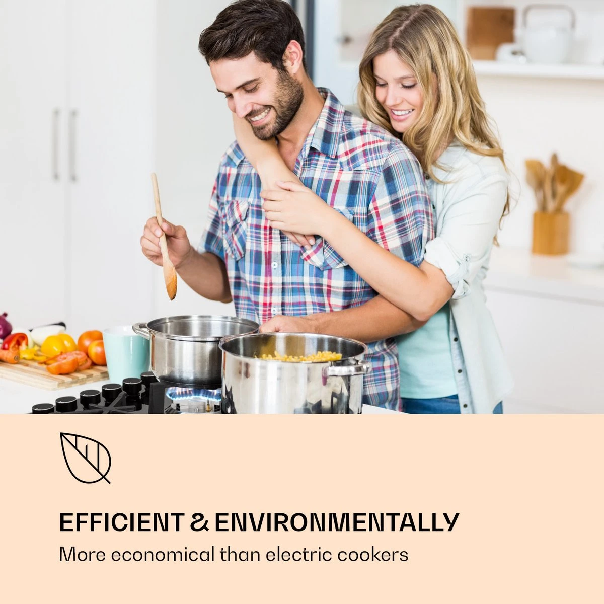 De Klarstein Trifecta 6 gaskookplaat bekoort in de eerste plaats door zijn driehoekige branders met bijzonder robuuste pannendragers van gietijzer. Door het driearmige ontwerp sturen deze warmte door sterk geconcentreerde vuurbronnen die bij het koken overtuigen door hun effiociëntie en snelheid. De exclusieve gaskookplaten zijn ingebouwd in een glaskeramisch veld met een dikte van 6 mm, waaronder de robuuste roestvrijstalen behuizing zicht bevindt. Met een vermogen van 3,2 kW verwarmt de grote brander de pannen op de gietijzeren pannendrager, terwijl 2 normale branders met elk een vermogen van 2,1 kW en de 3 extra branders met elk 1,15 kW het volle vermogen realiseren. Om de Trifecta 6 aan te steken is geen extra aansteker nodig, omdat het gasfornuis is voorzien van een elektrische ontsteking. De warmtetoevoer is heel eenvoudig te regelen via de draaiknop. 6-voudige efficiëntie, snelheid en energiebesparing: das Klarstein Trifecta 6 gaskookplaat met driehoekige branders.